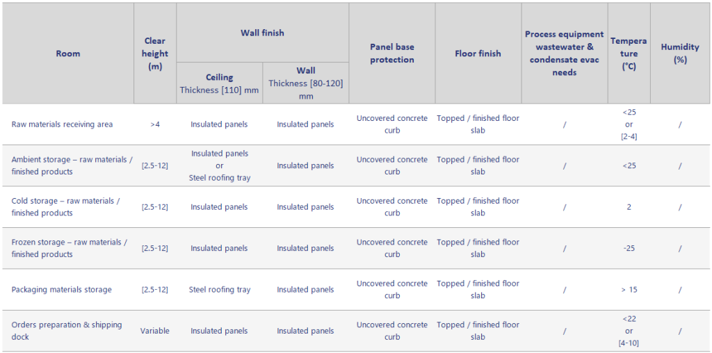 • These rooms must be cleaned regularly for hygiene reasons. Therefore, insulated sandwich panels and a tiled or resin-coated floor are required, along with a wastewater drainage system.